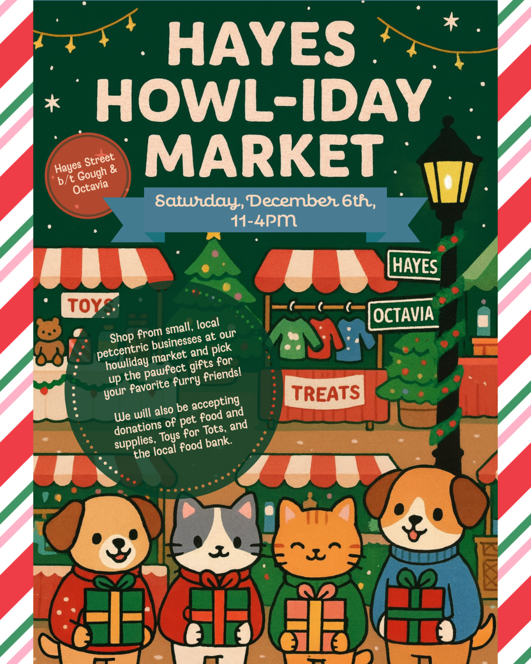 Join us in Hayes Valley on Saturday, December 6th, from 11-4PM, to shop from local makers and small businesses this season and give the gift of something extra special to your favorite fur babies!🎁